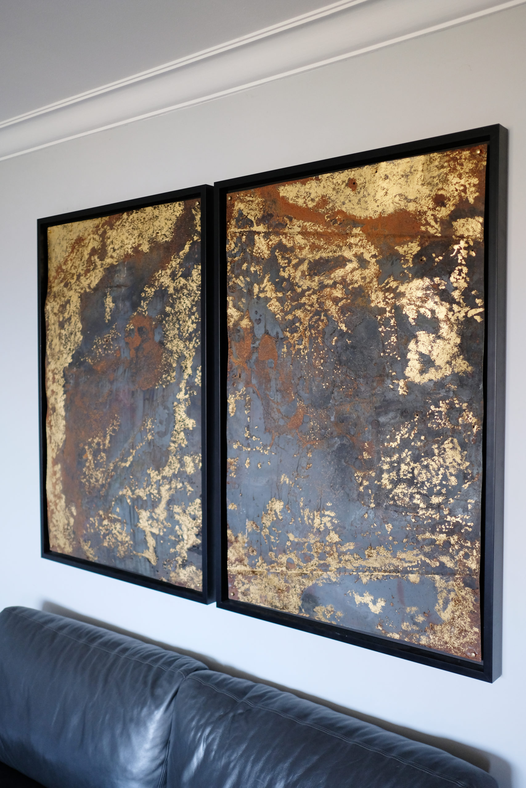 Diptic par Boris Gratry | Oct 5, 2018 | Artwork | 0 commentaires Diptic Cartography Calamine car hoods & Gold leaf 23.75 Cts American Boxing Frame Dim: 190 x 150 cm 2018