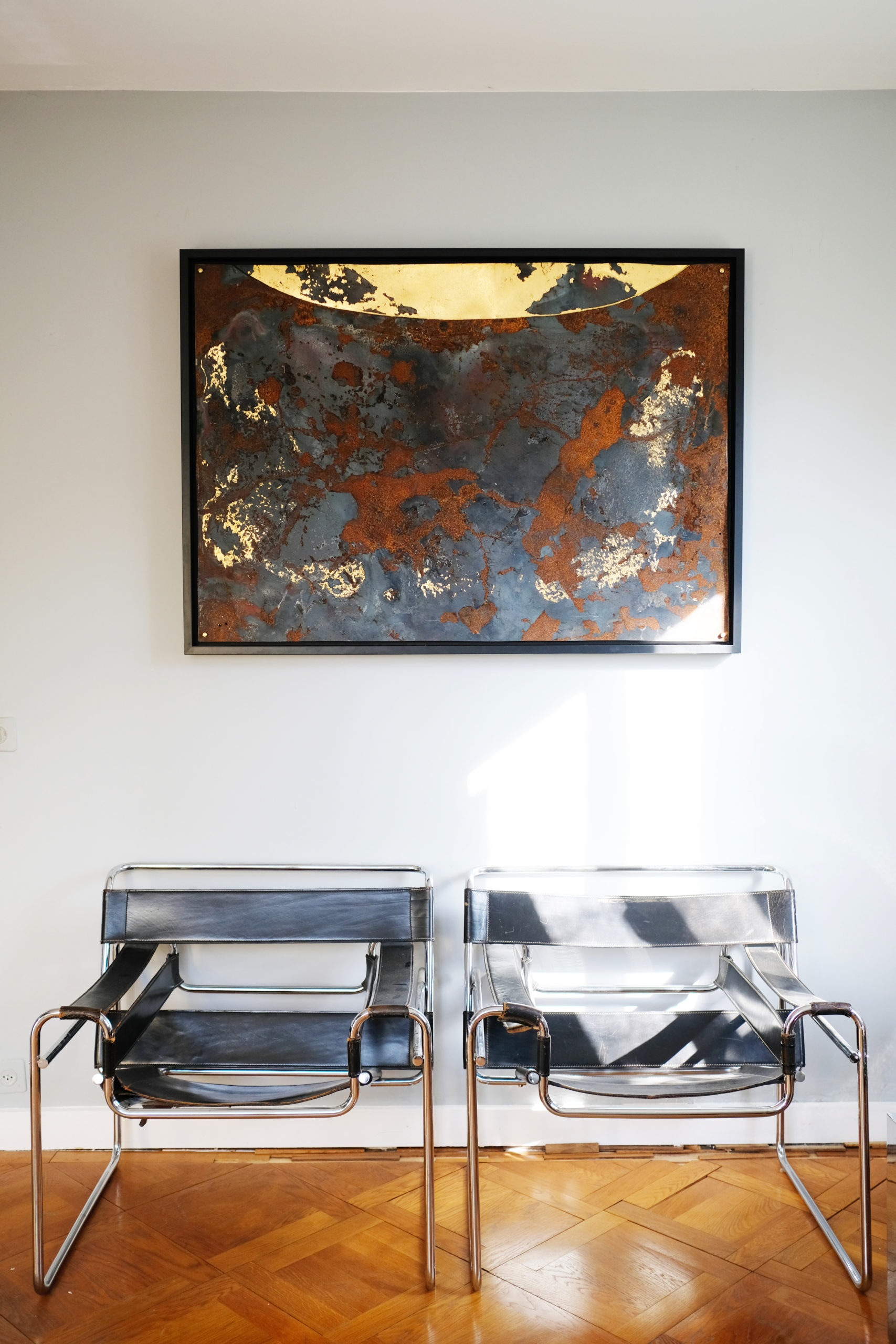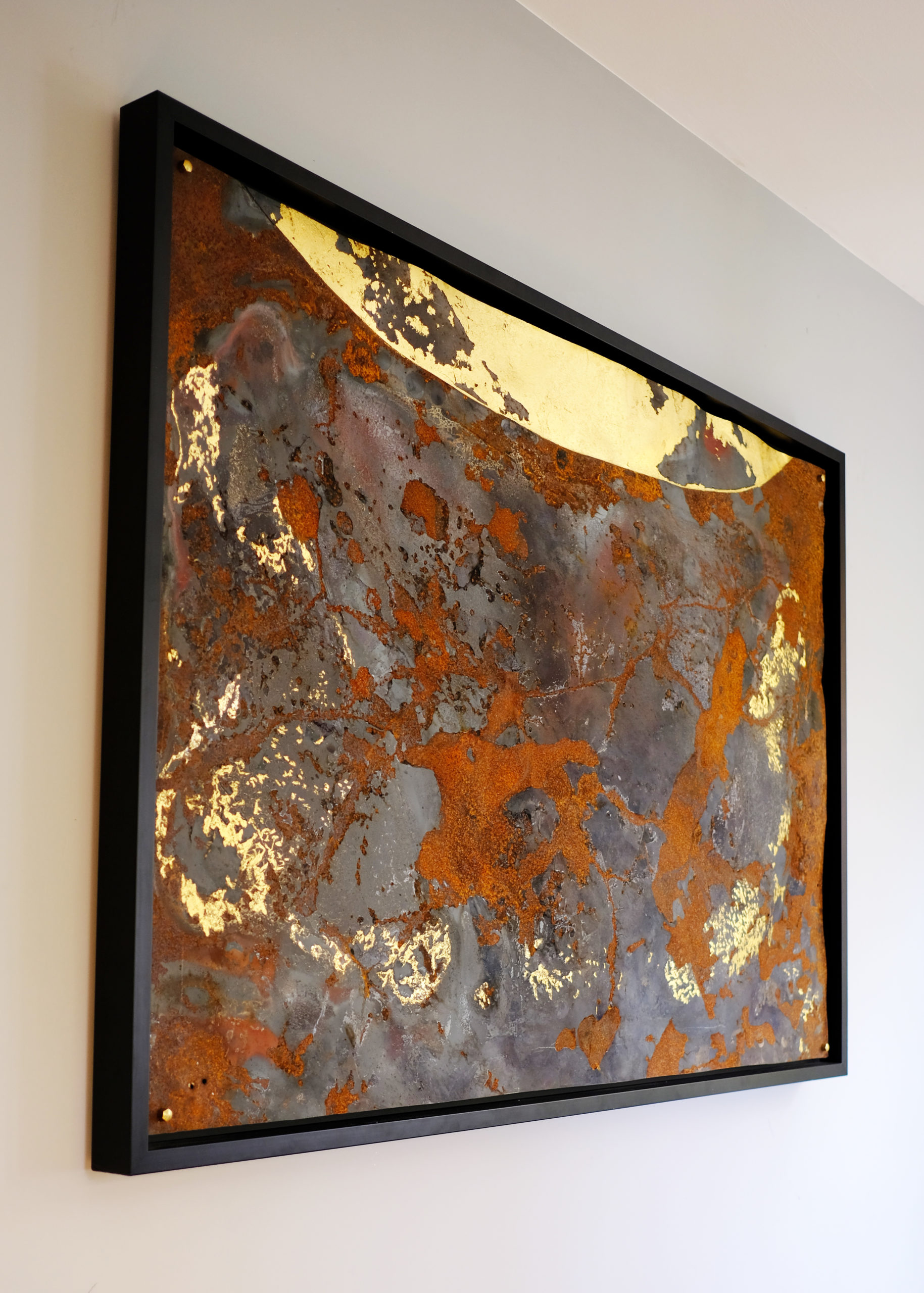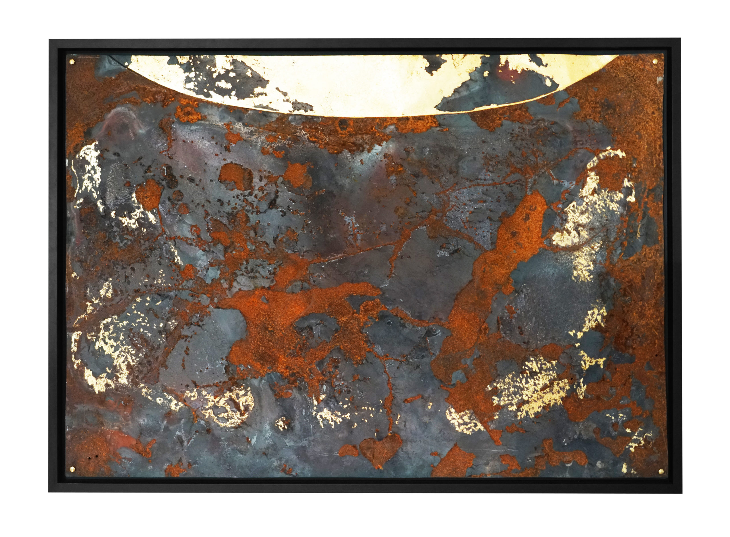 Earth view par admin | Déc 5, 2017 | Artwork, wallworks | 0 commentaires Earth view Calamine Car hood segement & Gold leaf 23.75 Cts Dim: 134 x 96 cm 2017