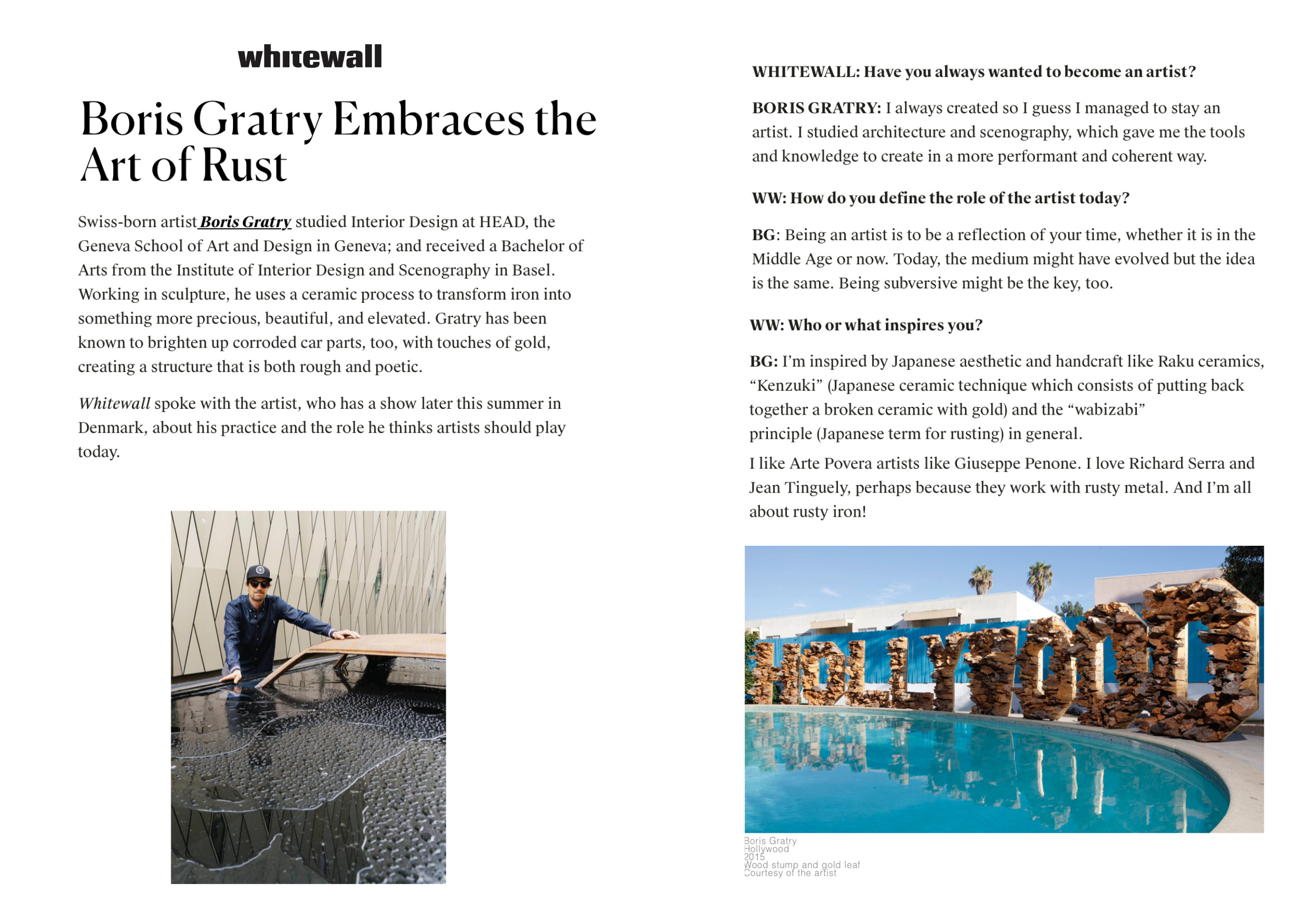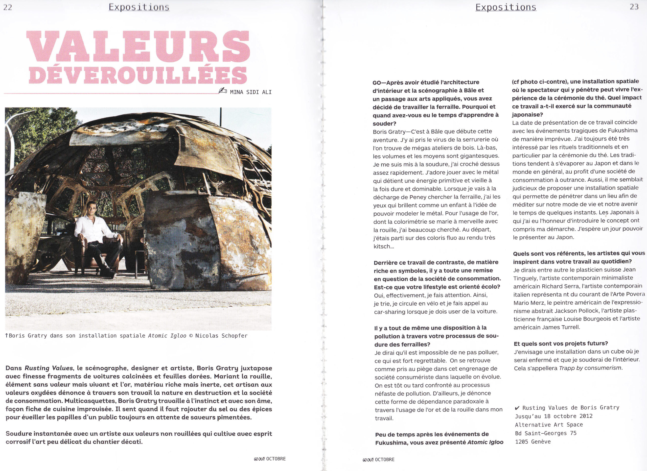 Swiss born with Russian descent, Boris Gratry is an interior designer and a scenographer exploring the boundaries of installative art. Earning his professional degree in Interior Design at the HEAD in Geneva, he followed with a bachelor of arts in Exhibition and Stage design from the Institute of Interior Design and Scenography in Basel (FHNW University of Applied Sciences & Arts, Switzerland). During his studies, he collaborated and led projects with “Group8″ Architects (Art Basel 2010, ICRC logistic complex). He was then hired at the international exhibition design studio in Stuttgart, Atelier Brückner, in the competition department with projects such as Frankfurt’s BMW museum. He joined the Geneva Opera House as Assistant stage manager for Umberto Giordano‘s « Andrea Chenier » and Mozarts‘s « Abduction from the Seraglio ». Strongly influenced by the Arte Povera and the Post Minimalist movement, Boris Gratry in his artwork is looking for a primary aesthetic embodied in the fight against consumerism.