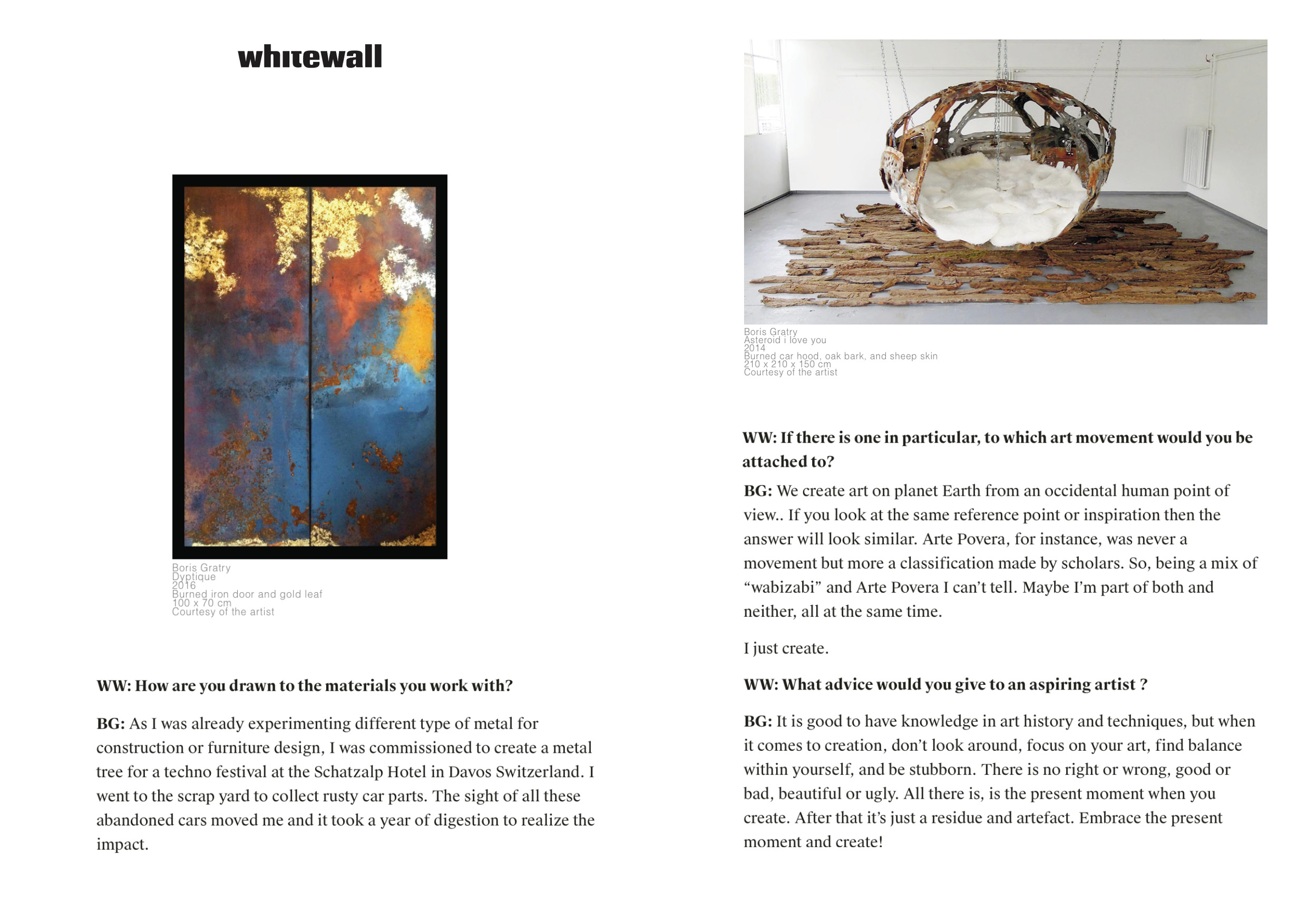 Opulence and decay find form in the sculptures of Swiss artist Boris Gratry, who works with car parts that are burned, rusted and embellished with gold leaf. The resulting abstract compositions are reminiscent from acclaimed minimalist and “Arte Povera » artists such as Richard Serra and Mario Merz. Boris Gratry transform his materials by hosting large happenings during which automobile segments are set on fire and violently cooled with water, changing its form and preparing it to rust. Variations in temperature dictate the metals‘ initial coloration, which the artist then accentuates with gold leaf appliqué. In doing so, Boris Gratry opposes notions of polarities: beauty vs. brutality, attraction vs. repulsion, wealth vs. poverty. By transforming scrap metal into something precious, the artist performs a kind of alchemy, elevating his materials from the mundane to the extraordinary.